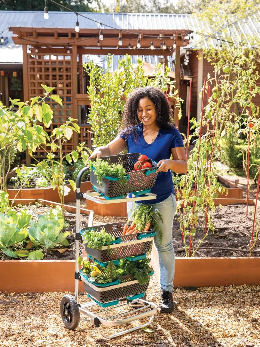 Expecting a big harvest this year? No need for multiple trips back and forth — simply fill up the three included Mod Hods, place them in the trolley, and wheel everything back at in one go!! The sturdy, lightweight aluminum frame is maneuverable, strong, and folds up flat and out of the way in between uses.